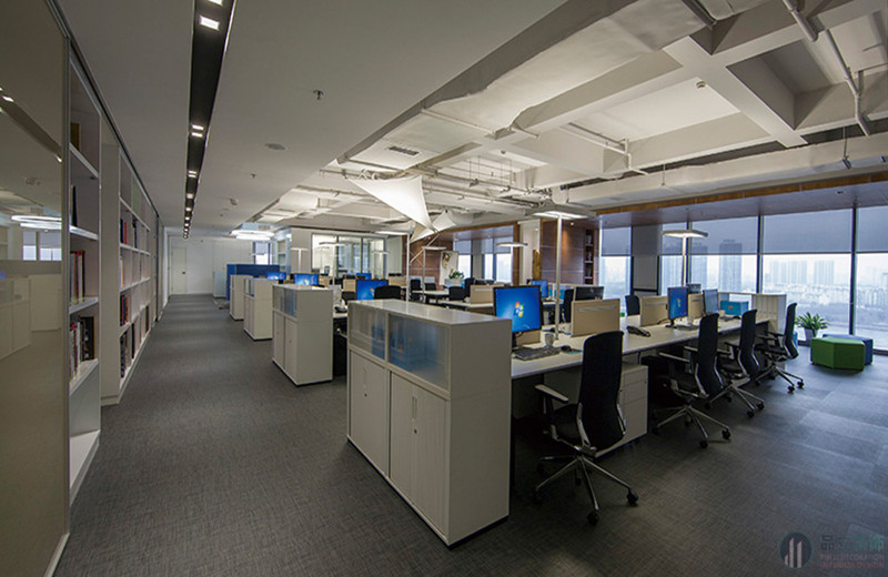 上海裝修設(shè)計公司之浦東金融大廈辦公樓裝潢設(shè)計效果,員工辦公區(qū)還是比較常規(guī)的裝修地面鋪設(shè)地毯,常規(guī)的開放式辦公桌等,一個亮點(diǎn)就是在茶水間和打印放置在一起使用柜子包裹不但可以放置一些打印設(shè)備還可以給員工放置日常用品。