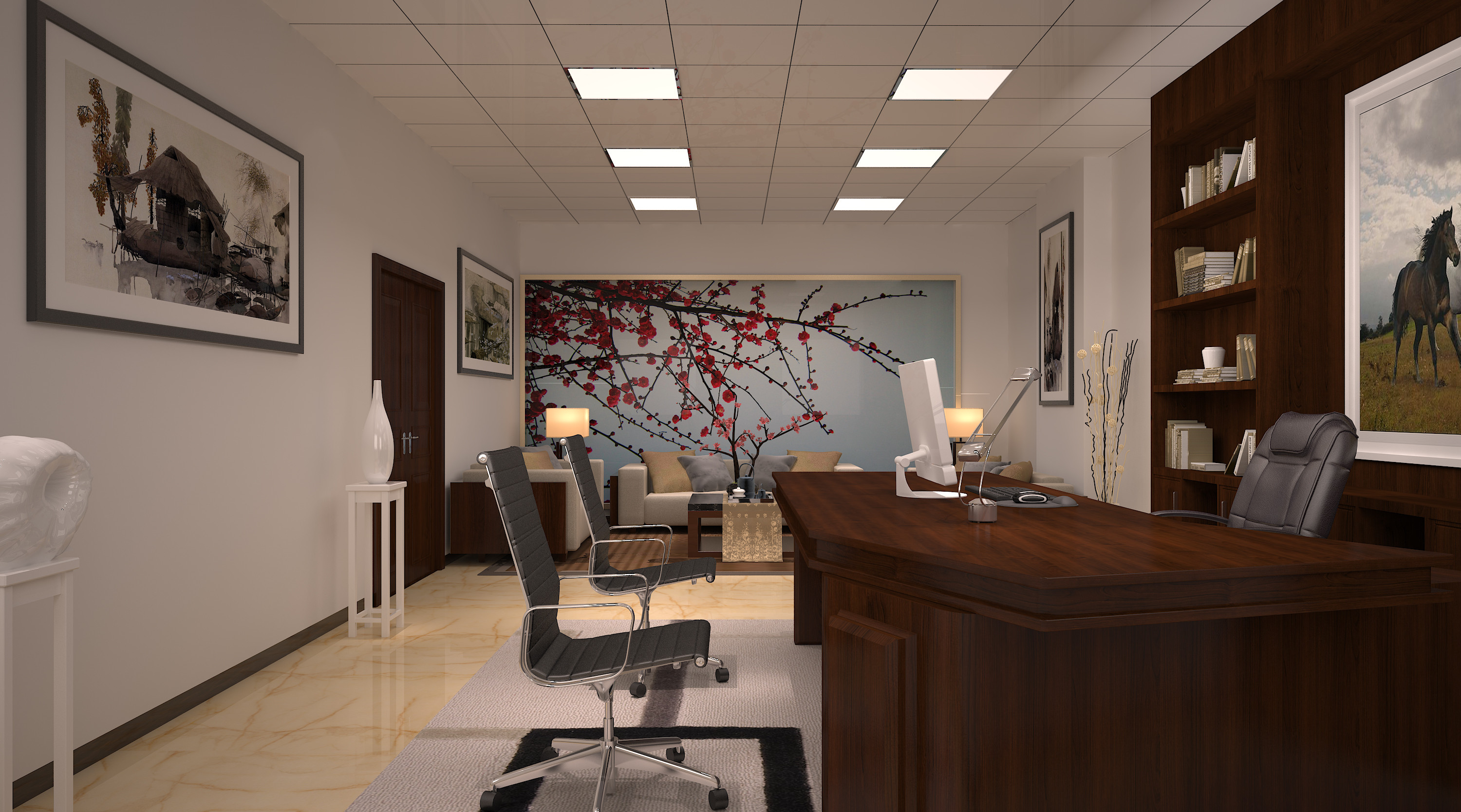首先,新中式風格辦公室的設計注重空間的流動性和層次感。設計師通過合理布局來創(chuàng)造一個寬敞明亮的空間,同時利用屏風、窗欞等傳統裝飾元素進行點綴,使整個空間顯得錯落有致。此外,通過運用木質地板和中式家具,可以進一步增強空間的傳統韻味。