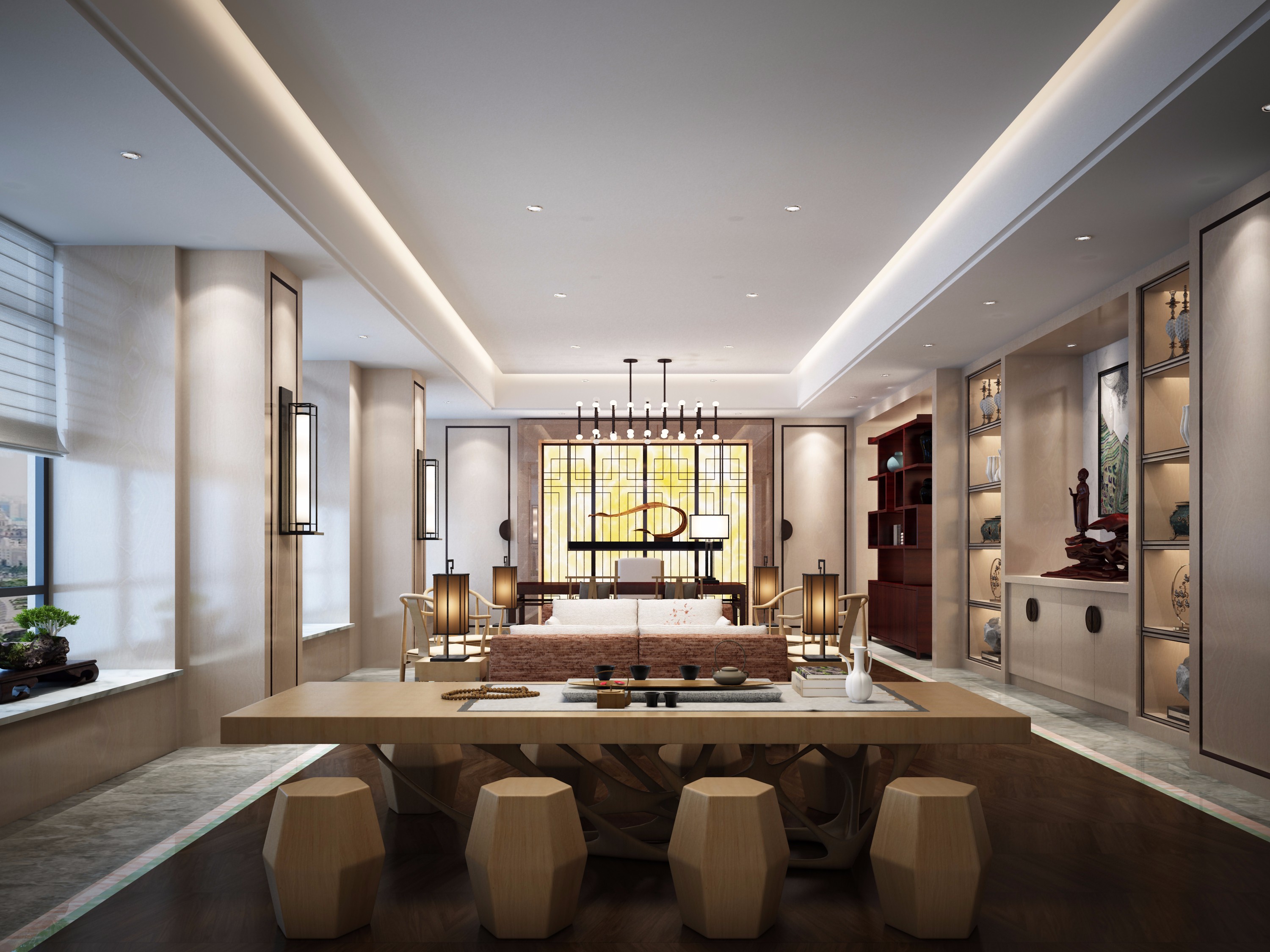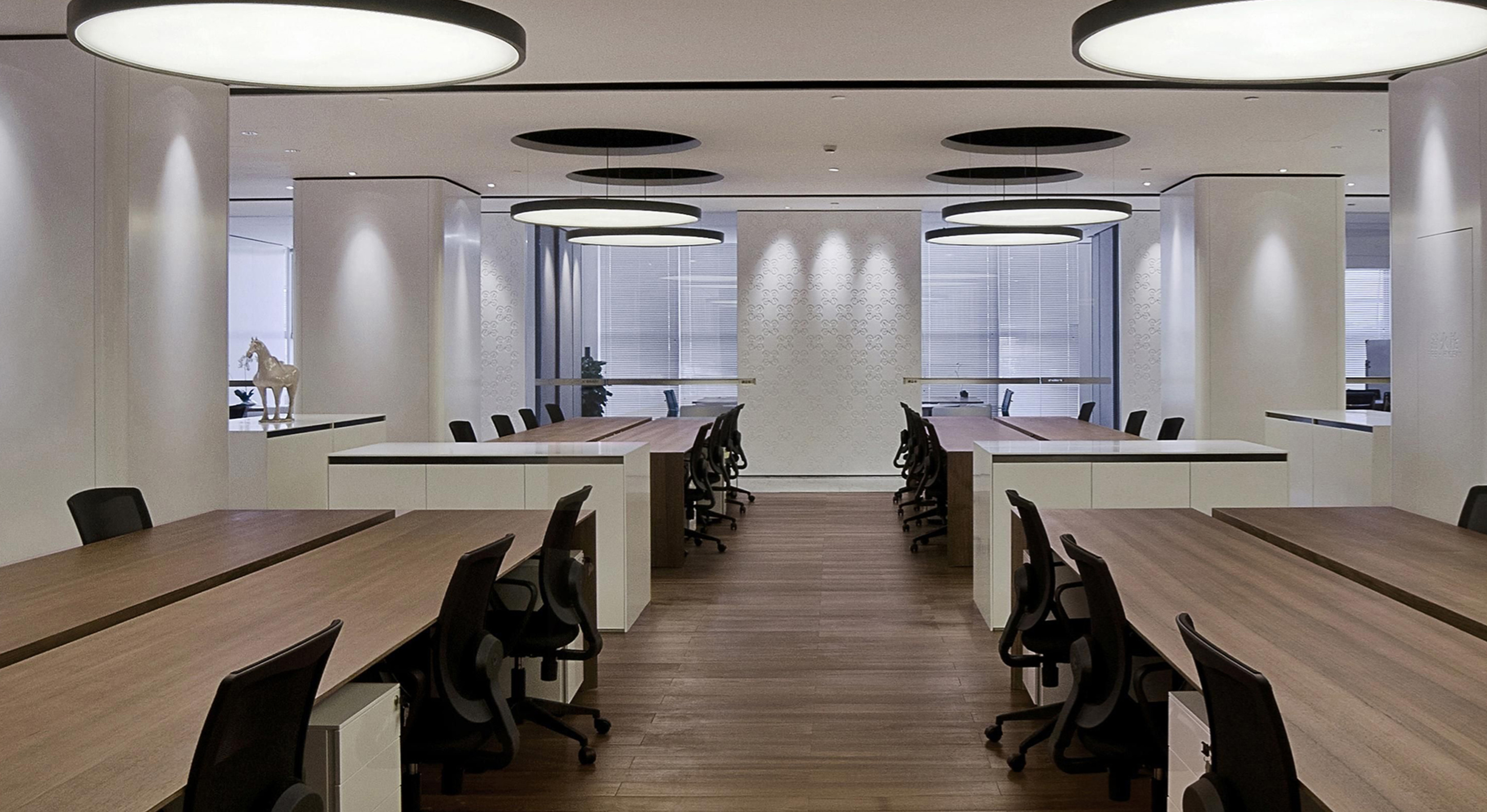 另外,在新中式風格辦公室中,燈光也是非常重要的設計元素之一。為了突出傳統文化的氛圍,可以使用吊燈、壁燈和臺燈等多種照明方式,營造出柔和的光線效果。同時,還可以通過調節(jié)燈光的亮度和色溫來實現不同的氛圍,以滿足不同工作場景的需求。